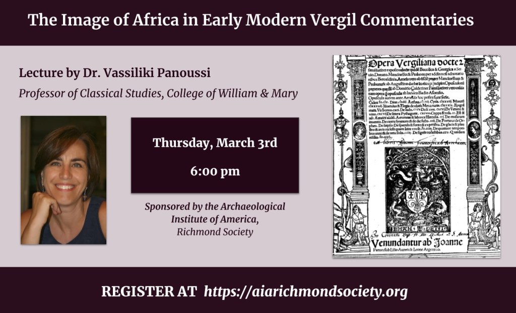 Join us on Zoom on Thursday, March 3 at 6 pm for a lecture by Dr. Vassiliki Panoussi (Professor of Classical Studies, College of William & Mary): “The Image of Africa in Early Modern Vergil Commentaries.” Click here to register!