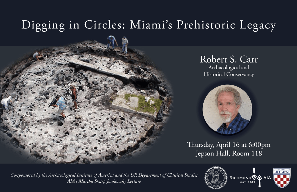 Our last lecture for this academic year will be Thursday, April 16 at the usual time and place (6 pm, Jepson Hall 118 on the University of Richmond campus): “Digging in Circles: Miami’s Prehistoric Legacy,” by Robert S. Carr (Archaeological and Historical Conservancy). This lecture is part of the national AIA’s Martha Sharp Joukowsky Lecture series. There will be a light reception preceding the lecture. Please join us!