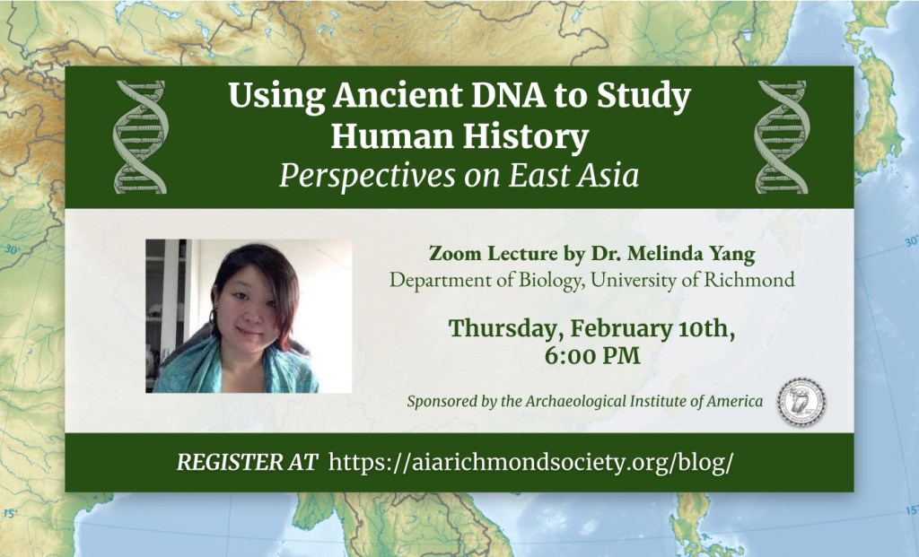 Please join us on Zoom on Thursday, February 10 at 6 pm EST for a lecture by Dr. Melinda Yang, Assistant Professor of Biology at the University of Richmond: “Using ancient DNA to study human history – perspectives on East Asia.”