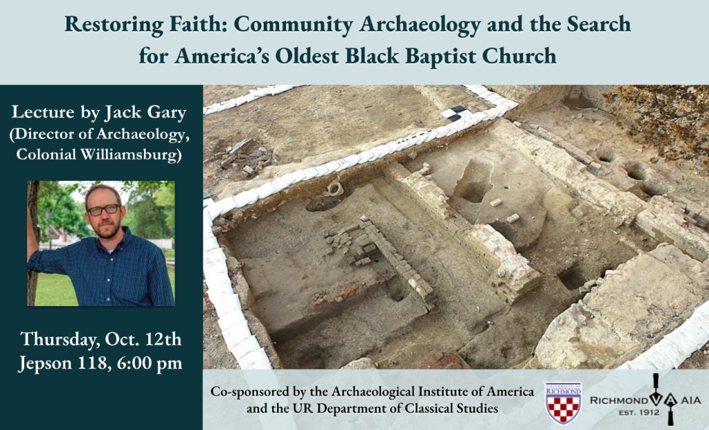 Join us for two exciting lectures this fall, and ‘save the dates’ for three lectures in the spring! All lectures are free and open to the public, co-sponsored by the University of Richmond Department of Classical Studies. Unless marked with an asterisk (*) below, all lectures will be held at 6 pm in 118 Jepson Hall, 221 Richmond Way, Richmond, VA 23173 (https://www.richmond.edu/visit/).